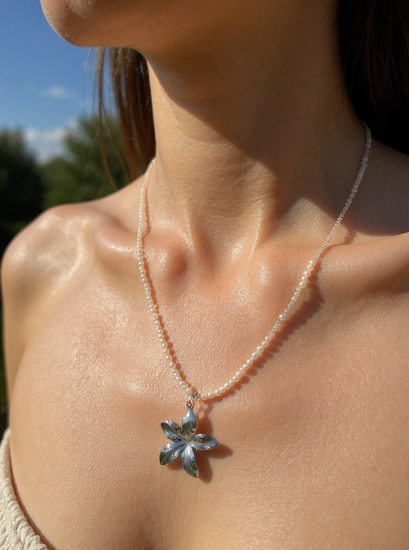 Handmade 2mm Freshwater Pearl Necklace with Silver Flower Charm